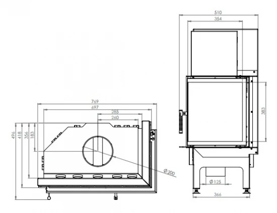 – Kaminkörper (zusätzlich verstärkt mit Rippen) und Kaminfront aus massivem Kesselstahl