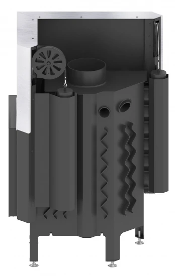– Kaminkörper (zusätzlich verstärkt mit Rippen) und Kaminfront aus massivem Kesselstahl