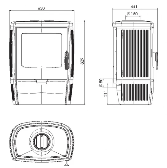 – Rauchrohranschluss: Ø 150 mm nur oben