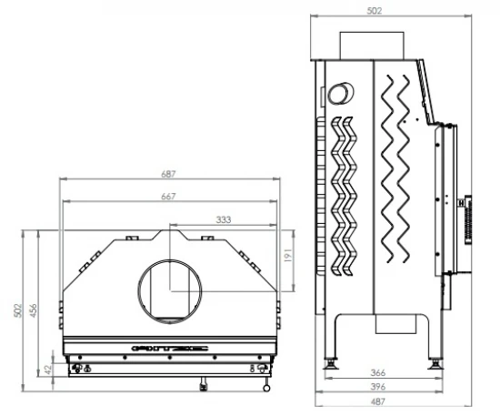 – Kaminkörper (zusätzlich verstärkt mit Rippen) und Kaminfront aus massivem Kesselstahl