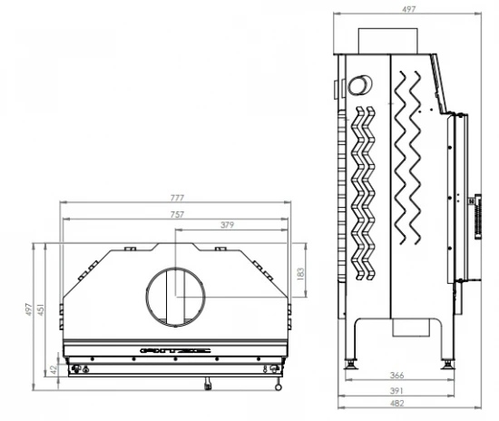 – Kaminkörper (zusätzlich verstärkt mit Rippen) und Kaminfront aus massivem Kesselstahl