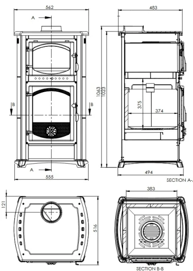 Sein 150 mm Rauchrohranschluss befindet sich oben. Seine Gusseisenherdplatte kann zum Kochen und Braten von Getränken und Speisen genutzt werden.